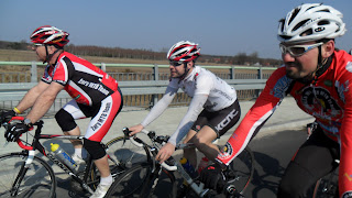 Dzisiaj przy dobrych warunkach atmosferyczny udało się nam zrealizować co tygodniowy niedzielny trening większym składem. W sumie pokonaliśmy 95 km równym tempem z kilkoma interwałami na podjazdach. W utrzymaniu całej grupy w jednej kupie przeszkadzał nam dość silny wiatr, ale dzięki sporej frekwencji pojawiła się możliwość poćwiczenia jazdy na rantach. Dzisiaj ja wraz z trzema innymi znajomymi z byłego klubu Żary MTB Team staliśmy się zawodnikami amatorskiej grupy Marek Konwa Racing Team, w której barwach będę starować w najbliższym sezonie 2012. Nie ukrywam, że taki układ bardzo mi pasuje i postaram się dobrze wypaść na priorytetowych wyścigach jakim będzie cykl Kaczmarek Electric MTB. W poprzednim sezonie startując w kilku edycjach na dystansie mini zająłem 2 miejsce w klasyfikacji generalnej kat. M2 oraz plasując się w pierwszej 10 open.